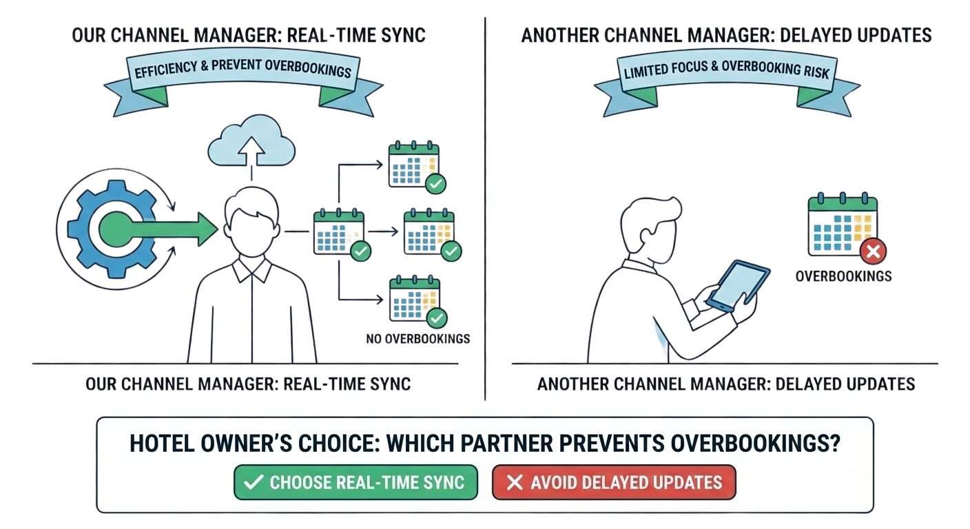 Hotels that use a Channel Manager experience up to 40% fewer overbookings compared to manual OTA management.