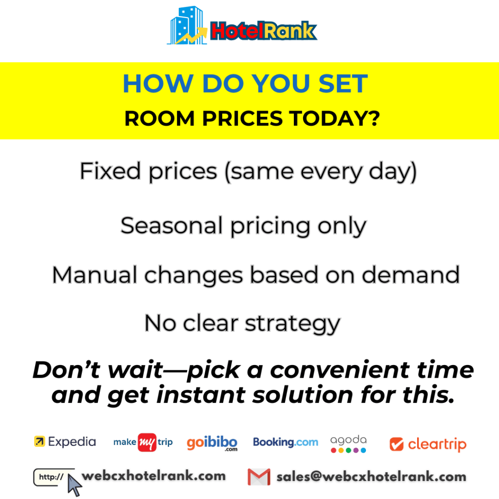 We help hotels,resorts, homestays, guests houses, vacation rentals, hotel chains maximize revenue, optimize pricing, and dominate OTA rankings. We focused on one thing: More bookings. More revenue. More profit.